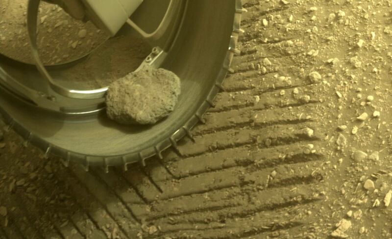 En uno de los desplazamientos de Percy, como cariñosamente se le llama al Perseverance, una pequeña roca cayó sobre una de sus ruedas y se quedó allí, atascada, como fiel acompañante.