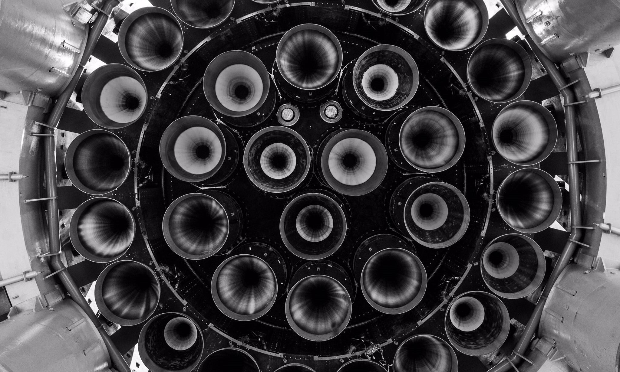 En la imagen compartida por SpaceX, se muestran 33 motores Raptor instalados en el booster y seis en la nave espacial. Cada uno produce 230-250 toneladas métricas de fuerza, una auténtica proeza del ser humano.