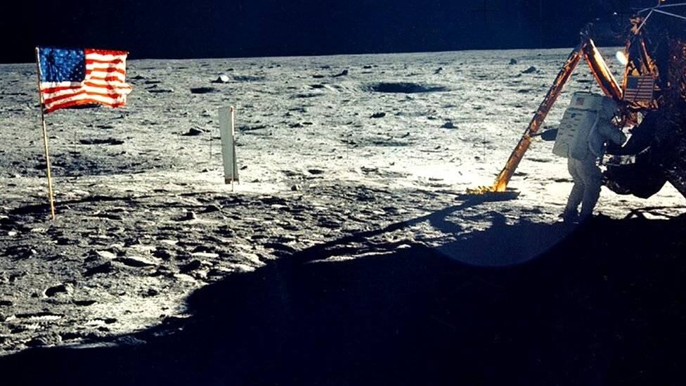 La misión fue lanzada un 16 de julio y llegó a la superficie lunar un 20 de ese mismo mes. El registro audiovisual del icónico momento muestra al par de astronautas instalando una bandera de los Estados Unidos en la Luna.