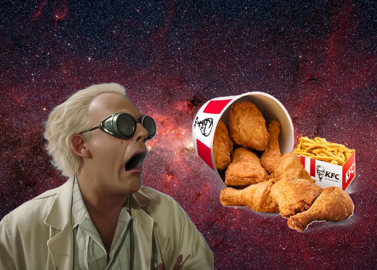 En la imagen, el espacio exterior se ve azul y la agrupación de lo que serían gas y polvo con estrellas y planetas en su interior, hacen la forma de un muslito de pollo, muy similar a la comida frita de la famosa cadena de comida nacida en North Corbin (Kentucky), pero ajora extendida en casi todo el mundo.