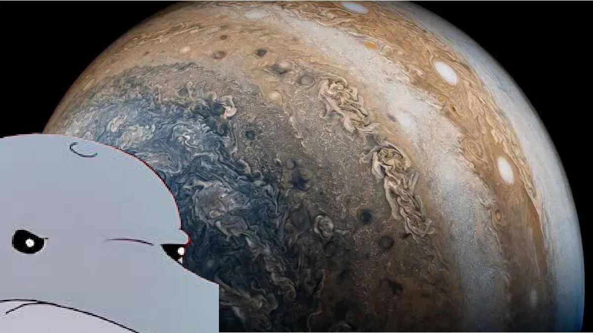 En este caso le tocó a Júpiter y la forma que todos vemos es claramente la de un delfín recorriendo la superficie.