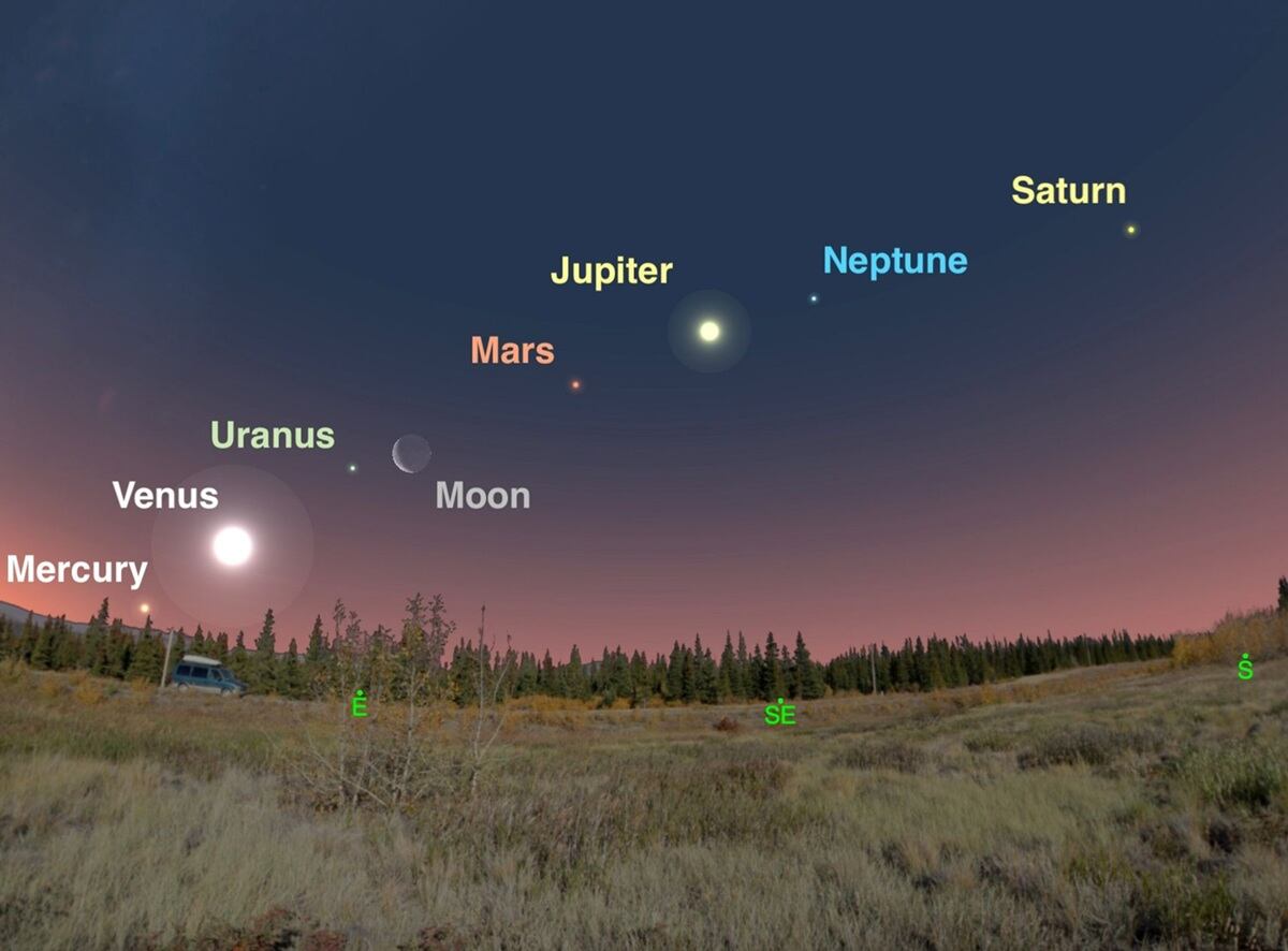 El mejor punto se da este viernes 28 de febrero, noche donde desde nuestra vista se formará esa línea de siete mundo ubicados como una especie de fila.
