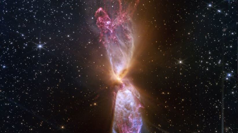 Lo que capta el Telescopio Espacial James Webb es lo que ven en nuestra imagen de portada. Son dos estrellas jóvenes en plena formación y debido a esa condición son las responsables de los impactantes chorros de gas y polvo en tonos naranja, azul y púrpura.