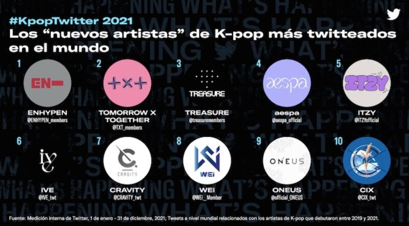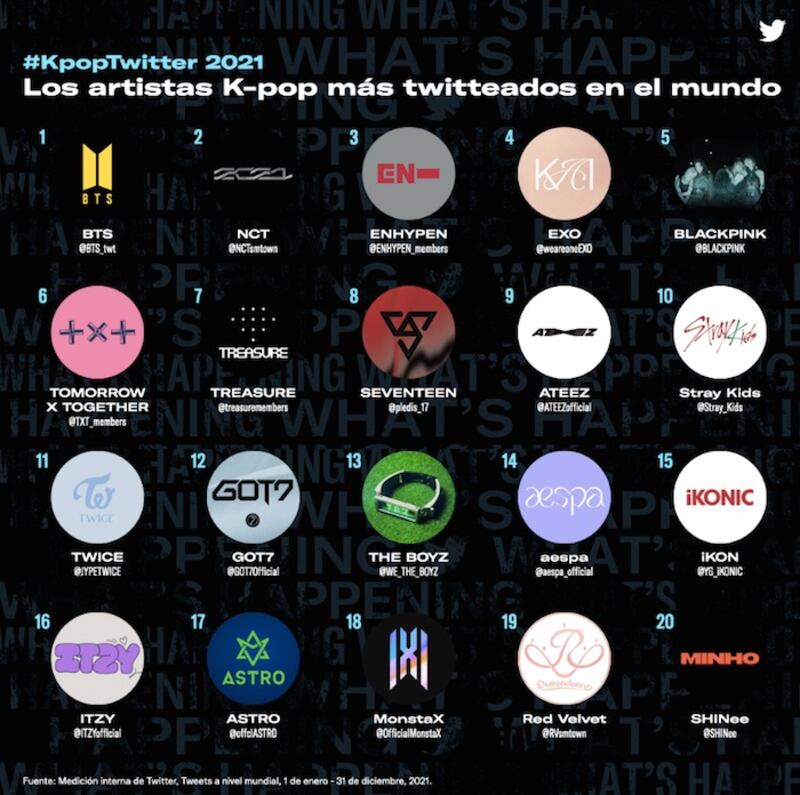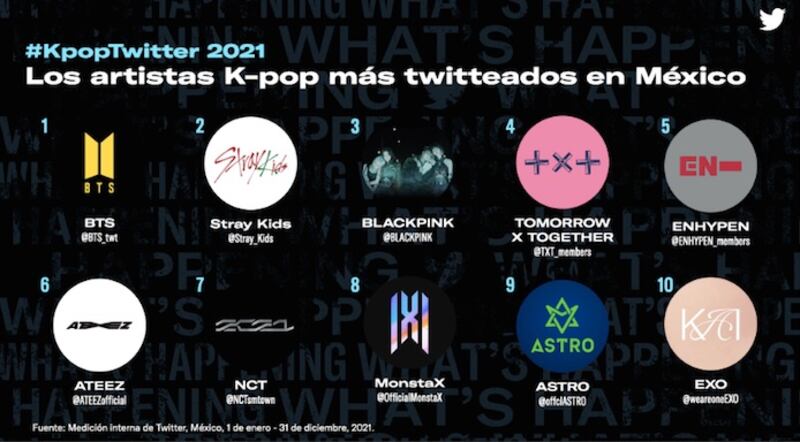 Por último en México los tres artistas de k-pop más twitteados en 2021 fueron BTS ( Big Hit Entertainment / HYBE Labels), Stray Kids (JYP Entertainment) y BLACKPINK (YG Entertainment).