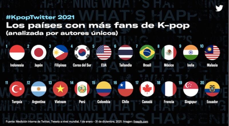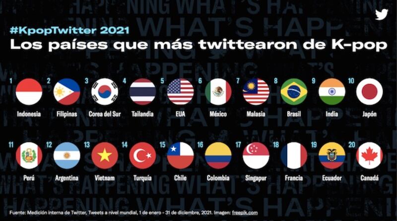 Entre los 20 países que más twittearon de k-pop durante el 2021 podemos encontrar a México en el lugar número 6, Brasil en el 8, Perú en el 11, Argentina en el 12, Chile en el 15, Colombia en el 16 y Ecuador en el 19.