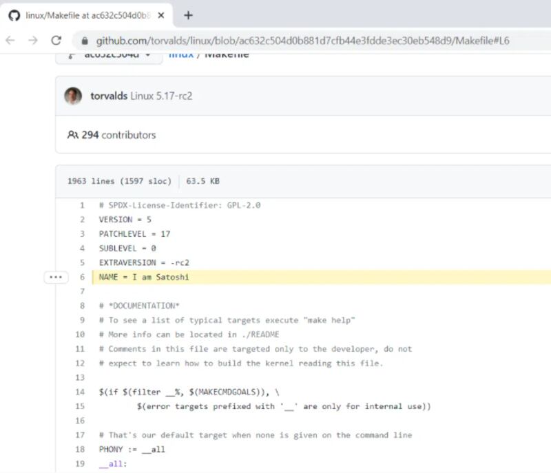 “Name: I am Satoshi”. Esta fue la frase que dejó Linus Torvalds, desarrollador del sistema operativo Linux, en medio de un código kernel, atribuyéndose la misteriosa figura de Satoshi Nakamoto, el presunto creador de Bitcoin.