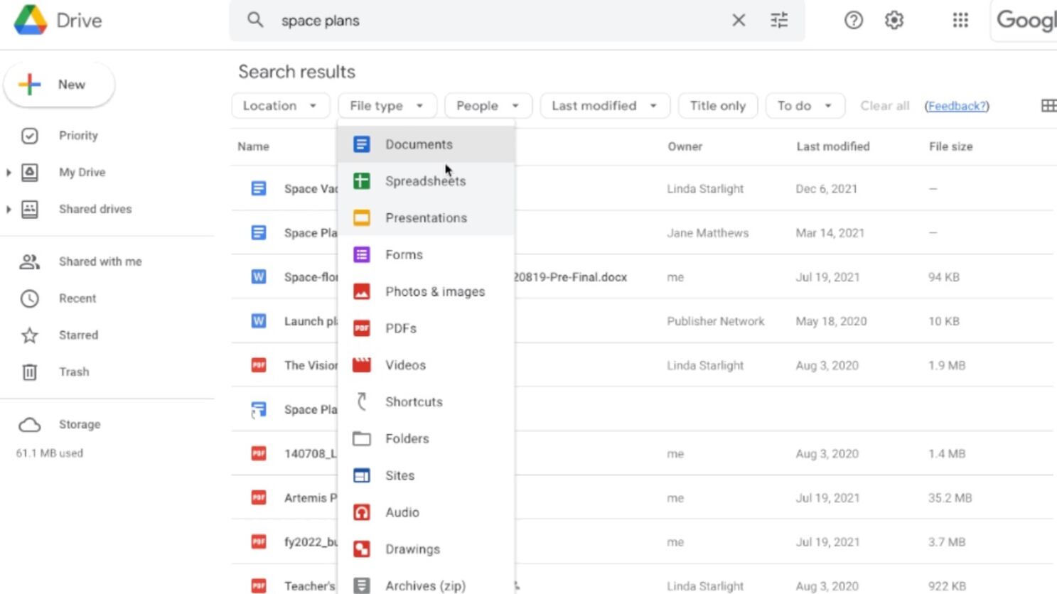 Para evitar casos en los que los usuarios buscan en Drive términos de archivos que puedan arrojar resultados demasiado amplios, como ‘plan de marketing’ o ‘informe de ventas’, los filtros se ubican por debajo de la barra de búsqueda y se muestran después de realizarla. Estos filtros de búsqueda permiten que los resultados se afinen por tipo de archivo, según sea un documento, un PDF o una imagen, por ejemplo, según quién sea su propietario o según la carpeta en la que se encuentre.