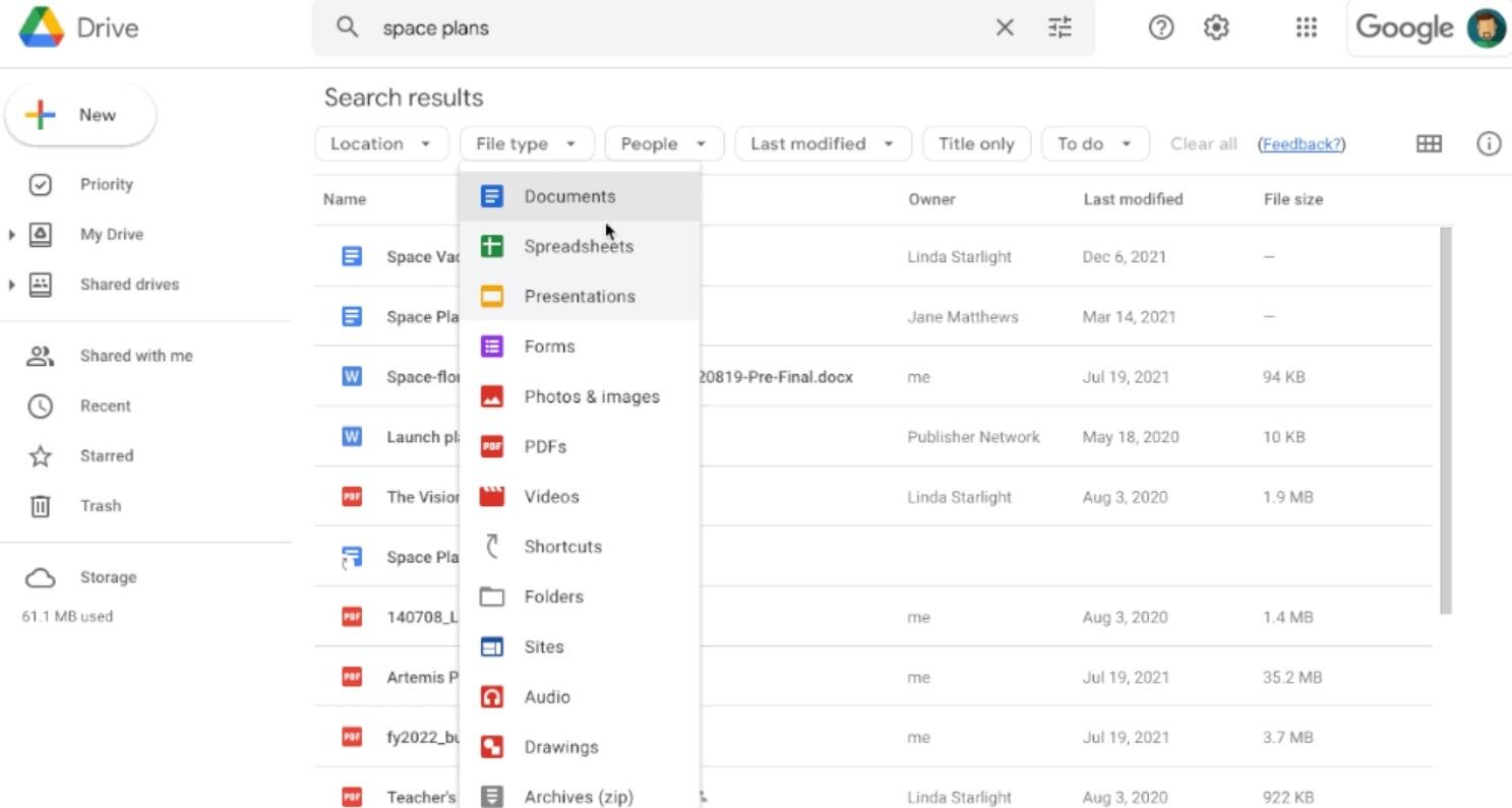Para evitar casos en los que los usuarios buscan en Drive términos de archivos que puedan arrojar resultados demasiado amplios, como ‘plan de marketing’ o ‘informe de ventas’, los filtros se ubican por debajo de la barra de búsqueda y se muestran después de realizarla. Estos filtros de búsqueda permiten que los resultados se afinen por tipo de archivo, según sea un documento, un PDF o una imagen, por ejemplo, según quién sea su propietario o según la carpeta en la que se encuentre.
