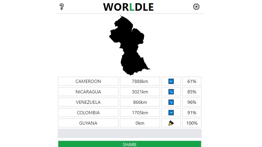 Al escribir la respuesta tentativa se irá desplegando una lista de la nación según el orden de lo que escribamos, al registrar una respuesta el juego nos dirá con un porcentaje qué tan cerca estuvimos de acertar, marcará a cuántos kilómetros se encuentra el país del sitio que adivinamos erróneamente y nos marcará con una flecha si está arriba, abajo o en diagonal en el mapa.