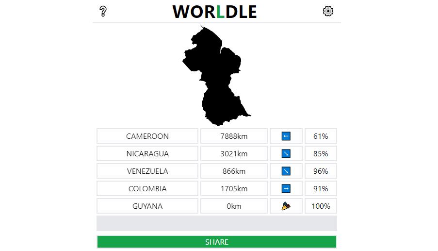 Al escribir la respuesta tentativa se irá desplegando una lista de la nación según el orden de lo que escribamos, al registrar una respuesta el juego nos dirá con un porcentaje qué tan cerca estuvimos de acertar, marcará a cuántos kilómetros se encuentra el país del sitio que adivinamos erróneamente y nos marcará con una flecha si está arriba, abajo o en diagonal en el mapa.
