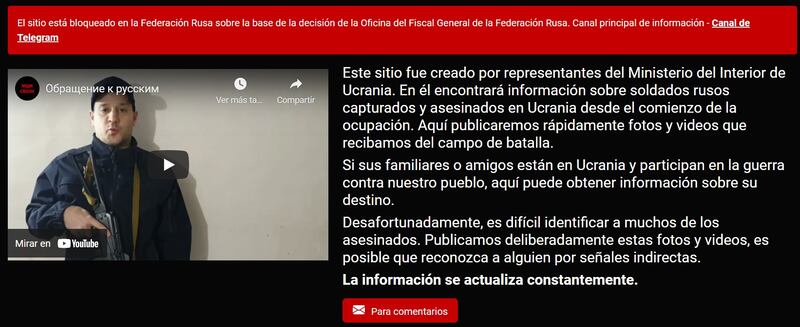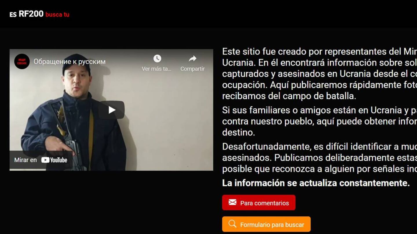 “Este sitio fue creado por representantes del Ministerio del Interior de Ucrania. En él encontrará información sobre soldados rusos capturados y asesinados en Ucrania desde el comienzo de la ocupación. Aquí publicaremos rápidamente fotos y videos que recibamos del campo de batalla”, anuncia la página a sus visitantes, y añade que la informació se actualiza constantemente.