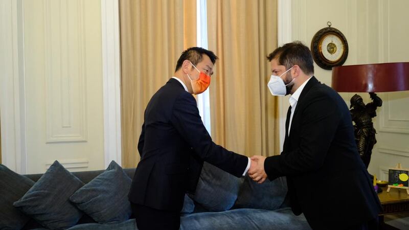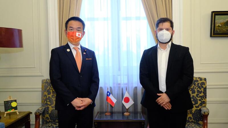 El ministro de Estado para Asuntos Exteriores de Japón, Kiyoshi Odawara, le entregó un particular regalo a Gabriel Boric en el marco de las reuniones bilaterales a un día del cambio de mando.