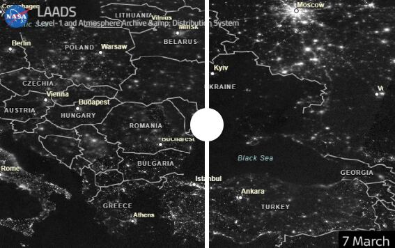 El impacto también puede verse aún más de cerca, en otra imagen comparativa de la NASA donde se observan las ciudades. Kiev, la capital, perdió casi toda la iluminación alrededor. Es una ciudad que aún resiste frente a los embates de Rusia.