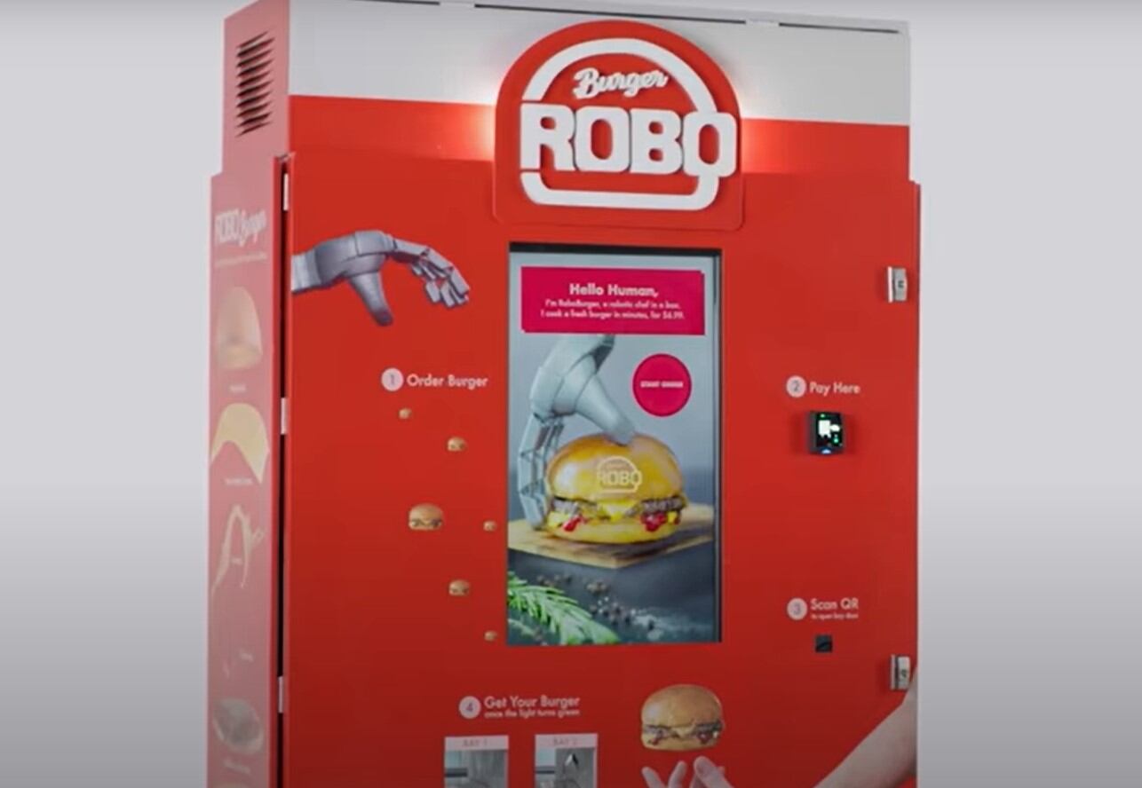 RoboBurger es el nombre de la empresa y el nombre de su principal producto: una máquina expendedora de hamburguesas. Igor Bonifacic de Engadget la descubrió en el Newport Center Mall de Nueva Jersey, Estados Unidos, y la ha descrito correctamente como un chef de hamburguesas autónomo.