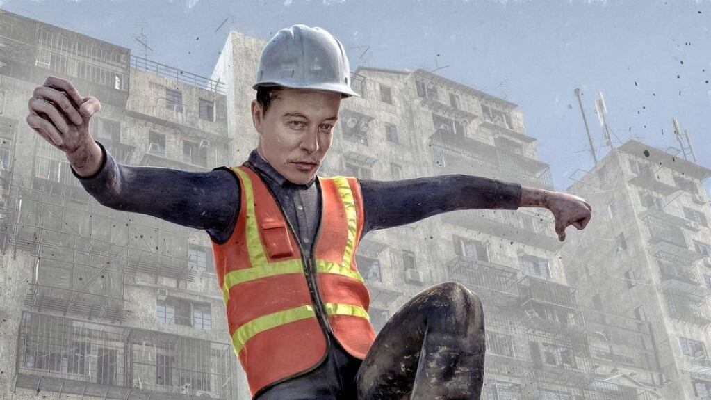 El jefe de SpaceX y Tesla, entre otras compañías, aparece con un traje de constructor, con casco, chaleco y botas de seguridad, intentando aplastar a algunos pájaros azules.