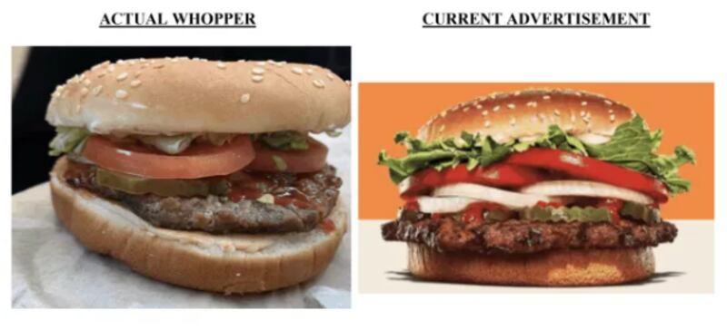 “(Los anuncios de Burger King) muestran sus hamburguesas como una carne de gran tamaño e ingredientes que se desbordan sobre el panecillo, para que parezca que las hamburguesas son aproximadamente un 35% más grandes y contienen más del doble de carne”.