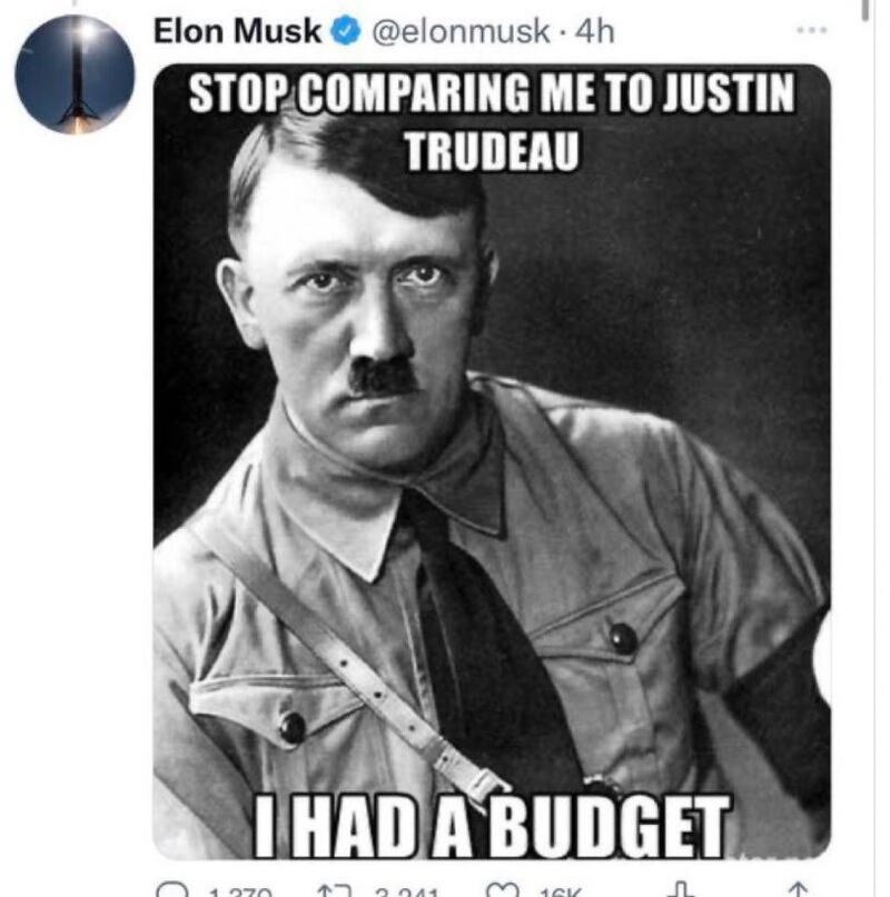 El jefe de Tesla y SpaceX publicó un meme de Adolf Hitler en el que lo comparaba con Trudeau, luego que el canadiense ordenara congelar las vías de financiación del llamado “convoy de la libertad”.