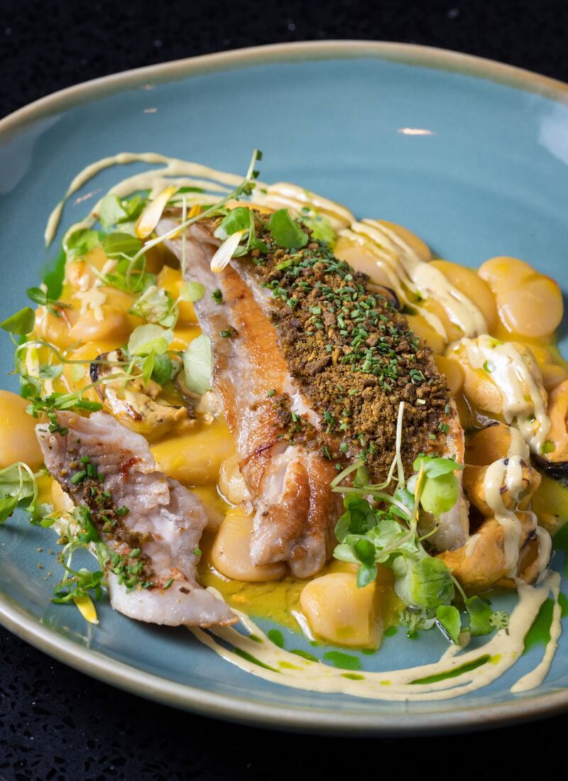 En el caso del plato de Mar pedimos el Pesce Mediterraneo: Pesca del día a la plancha con cremoso de arvejas a la menta, salteado de panceta, habas peladas, ensaladil un plato monocromático en donde el verde es el gran protagonista siendo un desafío para los instagrammers por lo difícil que es captar la belleza del plato por su tonalidad, algo que se olvida rápidamente después del primer bocado. Tuvimos la suerte de que el pez del día era Jerguilla, un pez de roca que consume crustáceos y moluscos entre otras cosas de su dieta.