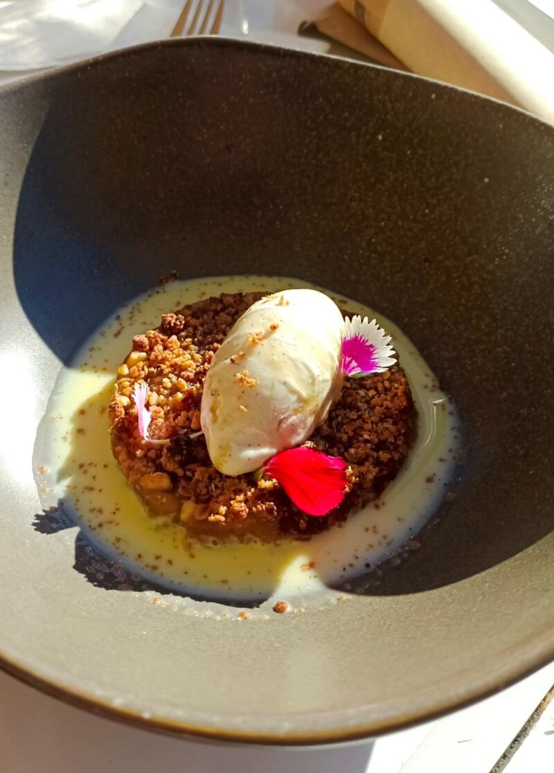 Mela Calda es como si el postre de tu mamá de una tarde de invierno hubiera estudiado una carrera universitaria y volviera graduado de la universidad con máxima distinción. Son manzanas asadas cubiertas con un crumble de avena y frutos secos, crema inglesa y helado de canela. Es imposible no sentir cosas lindas con este postre, las texturas de la avena con el resto de la preparación son extremadamente agradables y me llama profundamente la atención como ingredientes tan fáciles de encontrar pueden lograr una experiencia tan cálida y feliz en cada uno de sus bocados.