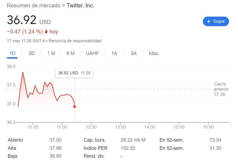 Al momento de escribir esta nota, las acciones de Twitter estaban siendo valoradas en menos de 37 dólares. Puede seguir en cayendo, lo que pone en discusión el precio de 44 mil millones de dólares que ofreció Elon Musk.