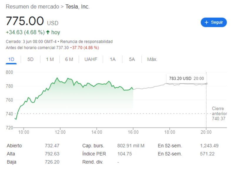 Antes del cierre del horario comercial del jueves, las acciones de Tesla habían caído un 4.86%. No obstante, aumentaron este viernes un 4.68% al momento de escribir esta nota, ubicándose en 775.00 dólares cada una.