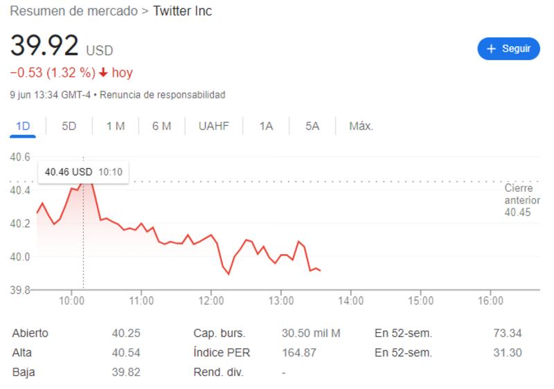 Las acciones de Twitter se han visto afectadas por el estira y encoge entre Musk y la compañía. Para este jueves, a la hora de redacción de esta nota, se ubicaban en 39.92 dólares cada una, con una baja del 1.32% en las últimas 24 horas.