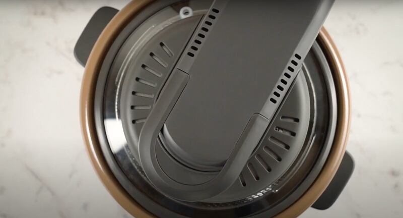 Para usar esta función, a diferencia del freido de aire, debes tener la tapa de la olla abierta. ¿Necesitas estar presente? De vez en cuando, para dar vuelta los alimentos, pero si debes ir al baño o ir a buscar un paquete a conserjería, los alimentos no se quemarán, no se pegarán, nada: el poder de la biocerámica.