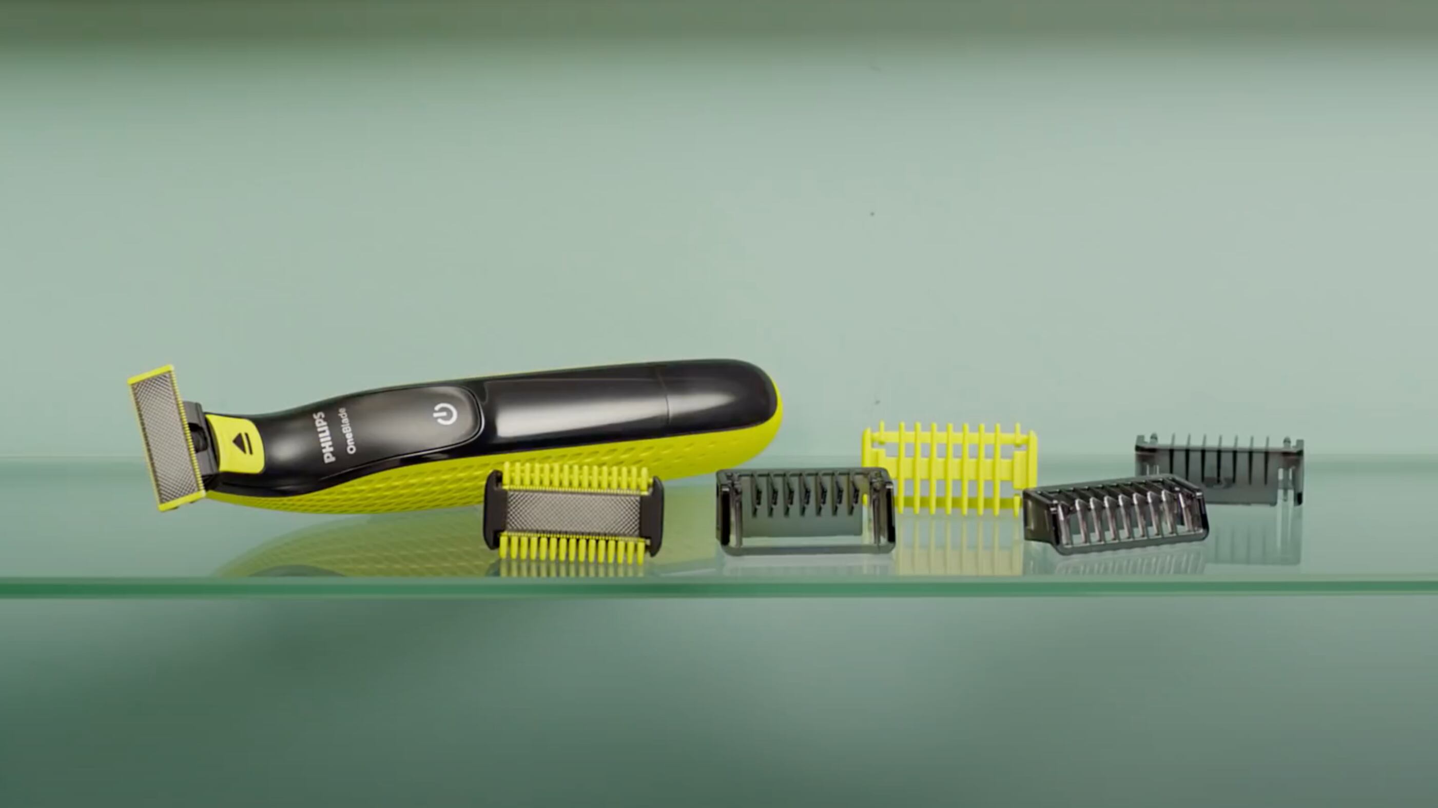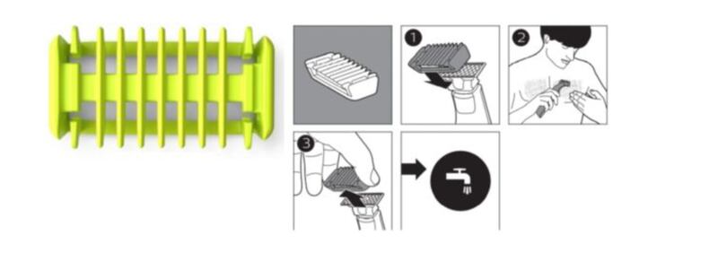 La nueva Philips OneBlade Face & Body incorpora 3 peines guía para el rostro (1, 3 y 5 mm.) para diferentes longitudes de barba, un peine adicional especialmente diseñado para el cuerpo y una cuchilla de repuesto, junto con una cubierta especial para proteger la piel, sobre todo en las zonas sensibles.
