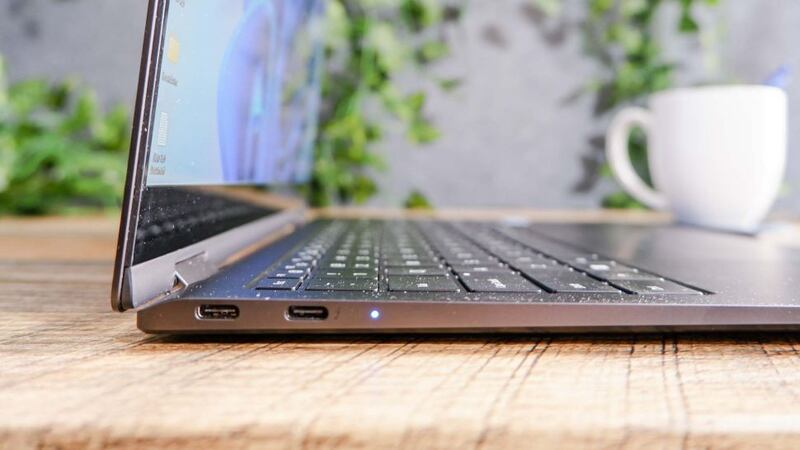 Este 2 en 1 tiene un par de puertos USB-C y un puerto USB-C/Thunderbolt 4. También tiene un lector de tarjetas microSD y un conector para auriculares. Los puertos están ubicados a ambos lados de la computadora portátil.