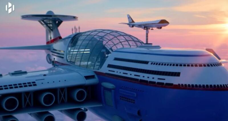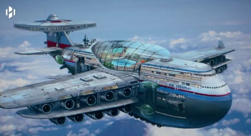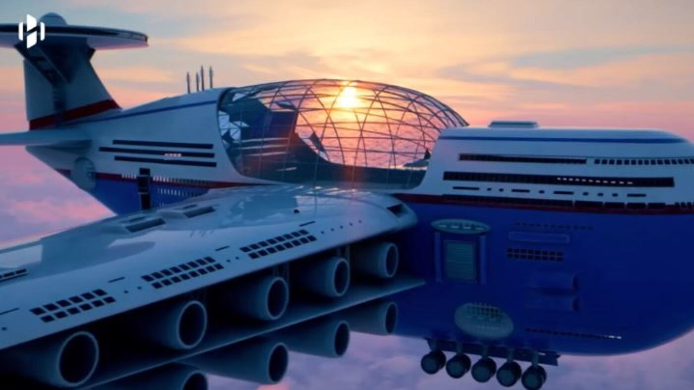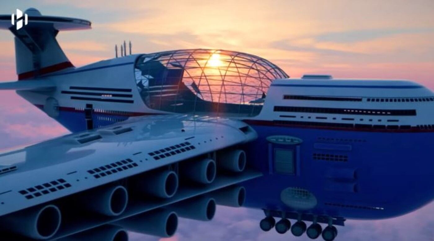 Es el híbrido futurista entre un avión y un crucero, con 20 motores propulsados por fusión nuclear “altamente controlada, para proveer al hotel con energía ilimitada”, con un avión pequeño que llevaría y traería a los pasajeros.