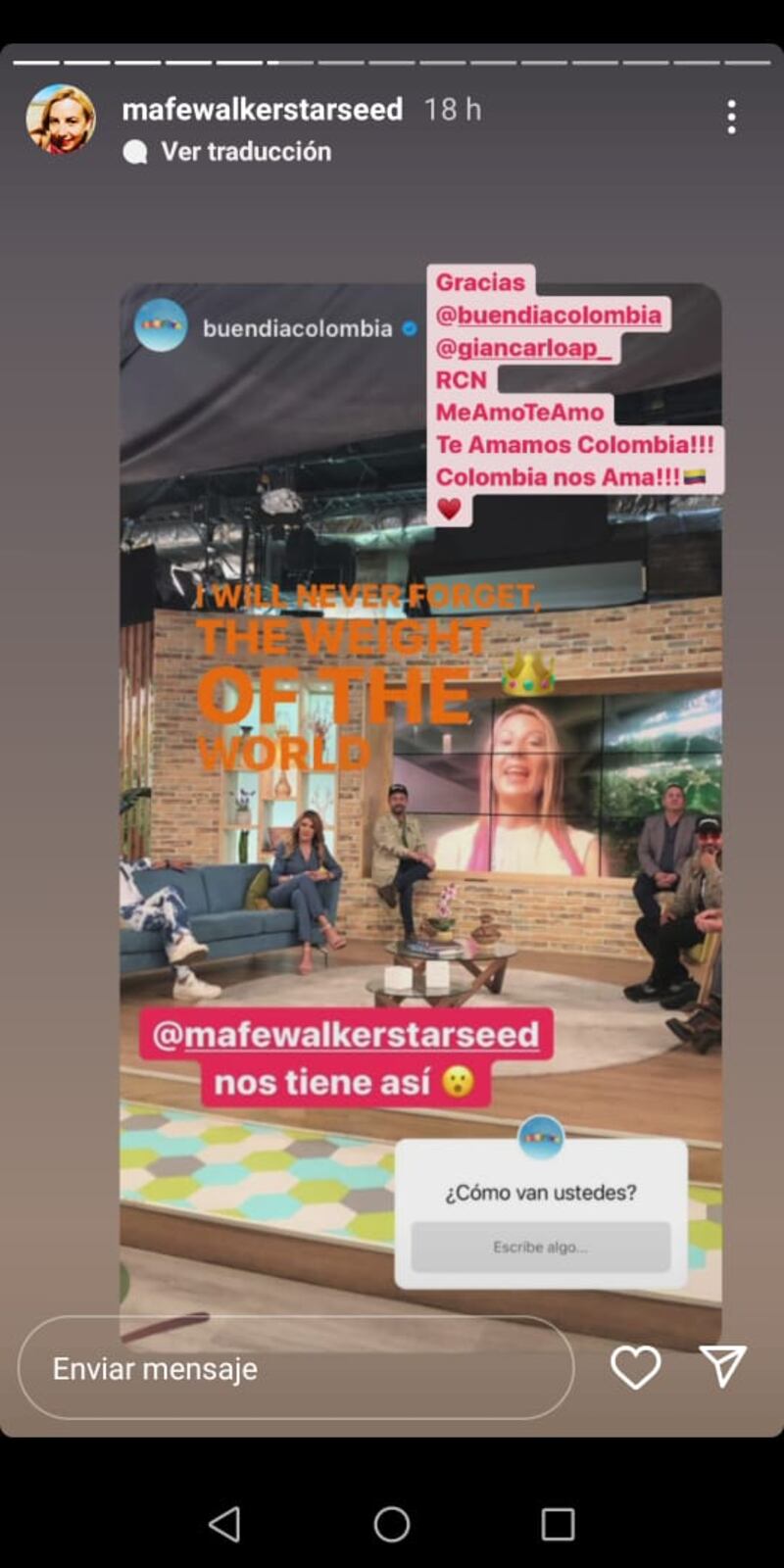 Pues en una mención que le hizo ‘Buen Día, Colombia’ en sus historias de Instagram, Mafe Walker aprovechó y reposteó con el siguiente mensaje: “Gracias, ‘Buen día, Colombia’, Giancarlo Alvarado; RCN, te amo, me amo. Te amamos Colombia. Colombia nos ama”.