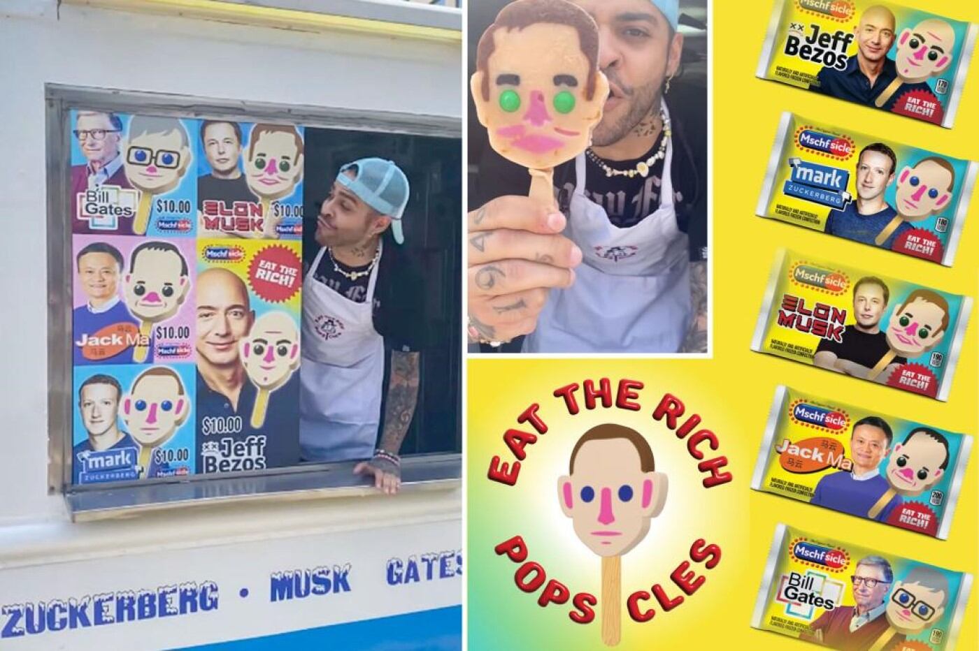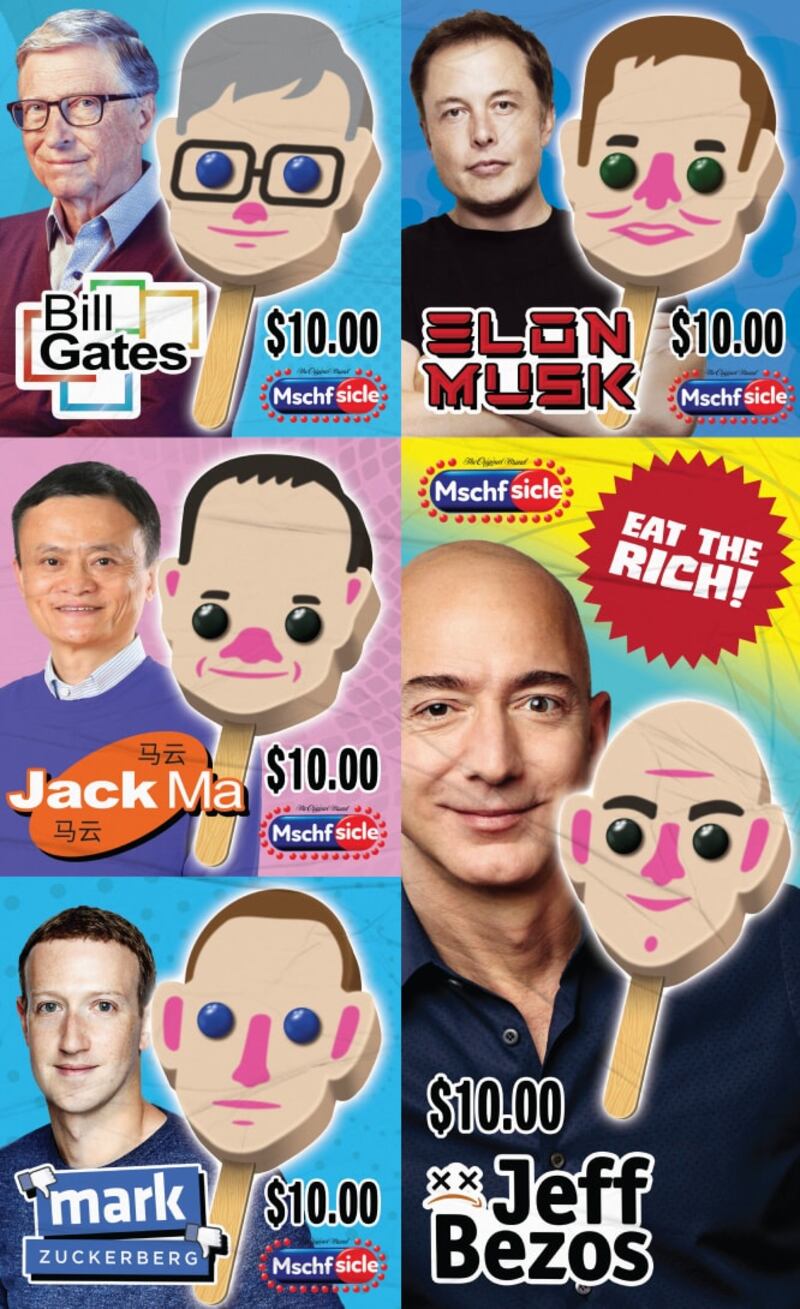 El colectivo de artistas MSCHF, de Brooklyn, está vendiendo los helados de los magnates en su propio camión. La venta se realiza en Nueva York y Los Ángeles, y bajo la marca Mschfsicle, un juego de palabras entre MSCHF y Popsicle, una popular paleta de helado en Estados Unidos.