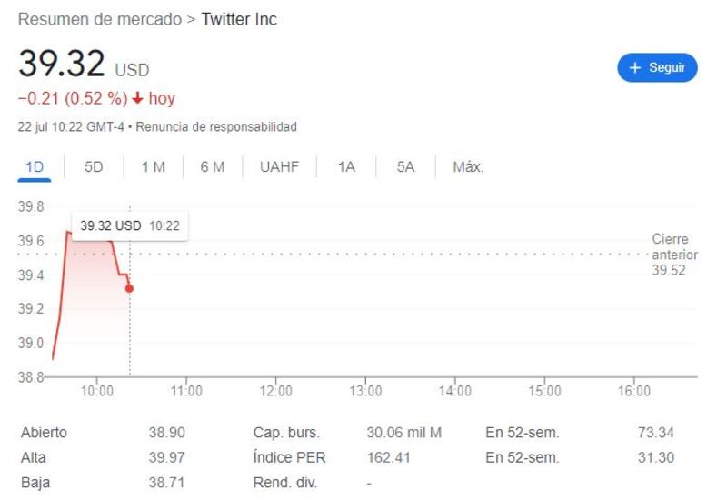 Para este viernes, las acciones de Twitter se sitúan a 39.32 dólares, una baja del 0.52% respecto a las últimas 24 horas.