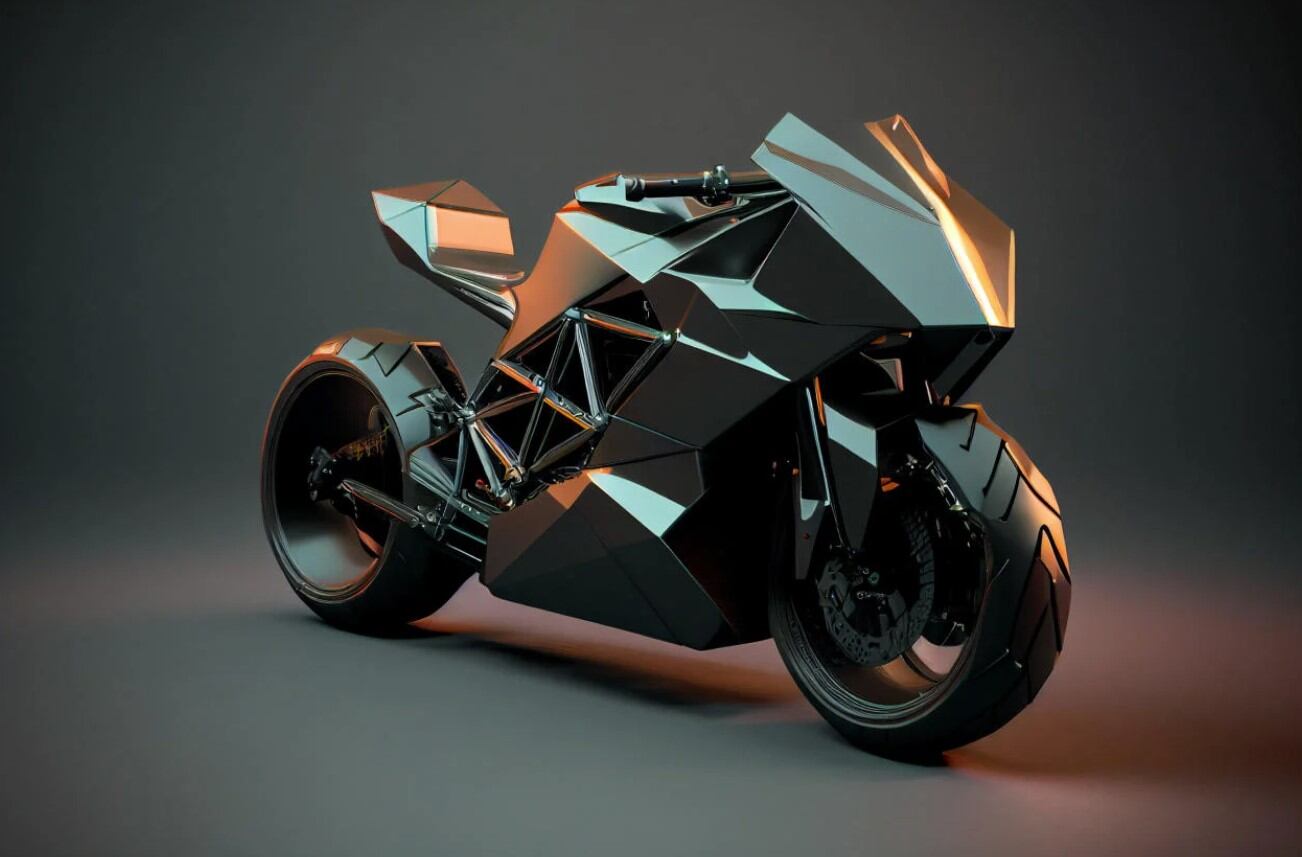 Las imágenes de la Cyberbike son obra de Sarang Sheth de Yanko Design y parece el hermano mayor del Tesla Cyberquad, con el mismo carenado de metal angular y vanguardista que alberga debajo el tren motriz eléctrico. Solo le dijo a la IA: “motocicleta eléctrica inspirada en el Tesla Cybertruck”.