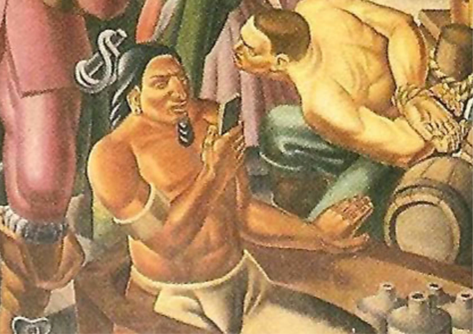 Más que un cuadro, se trata de un mural. Cuenta parte de la historia de los Estados Unidos. Es de la era del New Deal y se llama “Mr. Pynchon and the Settling of Springfield”. Claramente, es anterior al iPhone: por siete décadas.