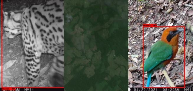 2. Cámaras trampa: El monitoreo con cámaras trampa es la segunda fuente de información que usa el modelo. Estas cámaras están equipadas con sensores infrarrojos que se activan cuando un animal pasa frente a ellas, capturando imágenes de la fauna silvestre en su hábitat natural. Estos datos son críticos, pues permiten recopilar evidencia fotográfica de especies raramente vistas y a menudo en peligro de extinción, todo ello con poco gasto, relativa facilidad y mínima perturbación a la vida silvestre. Los investigadores usan estas cámaras para documentar la presencia, abundancia y cambios en la población de la fauna, especialmente frente a la deforestación y destrucción del hábitat y para recopilar datos básicos sobre la población de especies tropicales donde muchas veces sólo era posible hacer estimaciones.