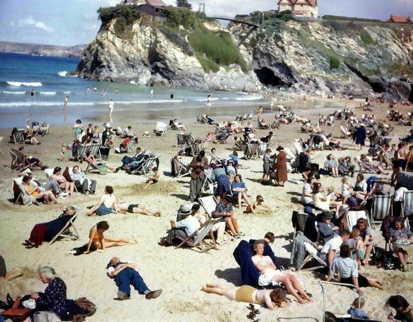 En este caso, la fotografía fue tomada originalmente en blanco y negro y luego coloreada, y muestra a trabajadores británicos disfrutando de un día en la playa durante la Segunda Guerra Mundial.