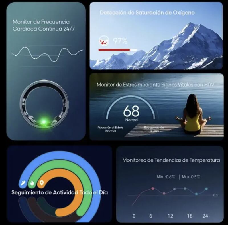 - Seguimiento de Salud las 24/7: Monitoreo continuo de tu frecuencia cardíaca, temperatura corporal, HRV, y niveles de estrés.