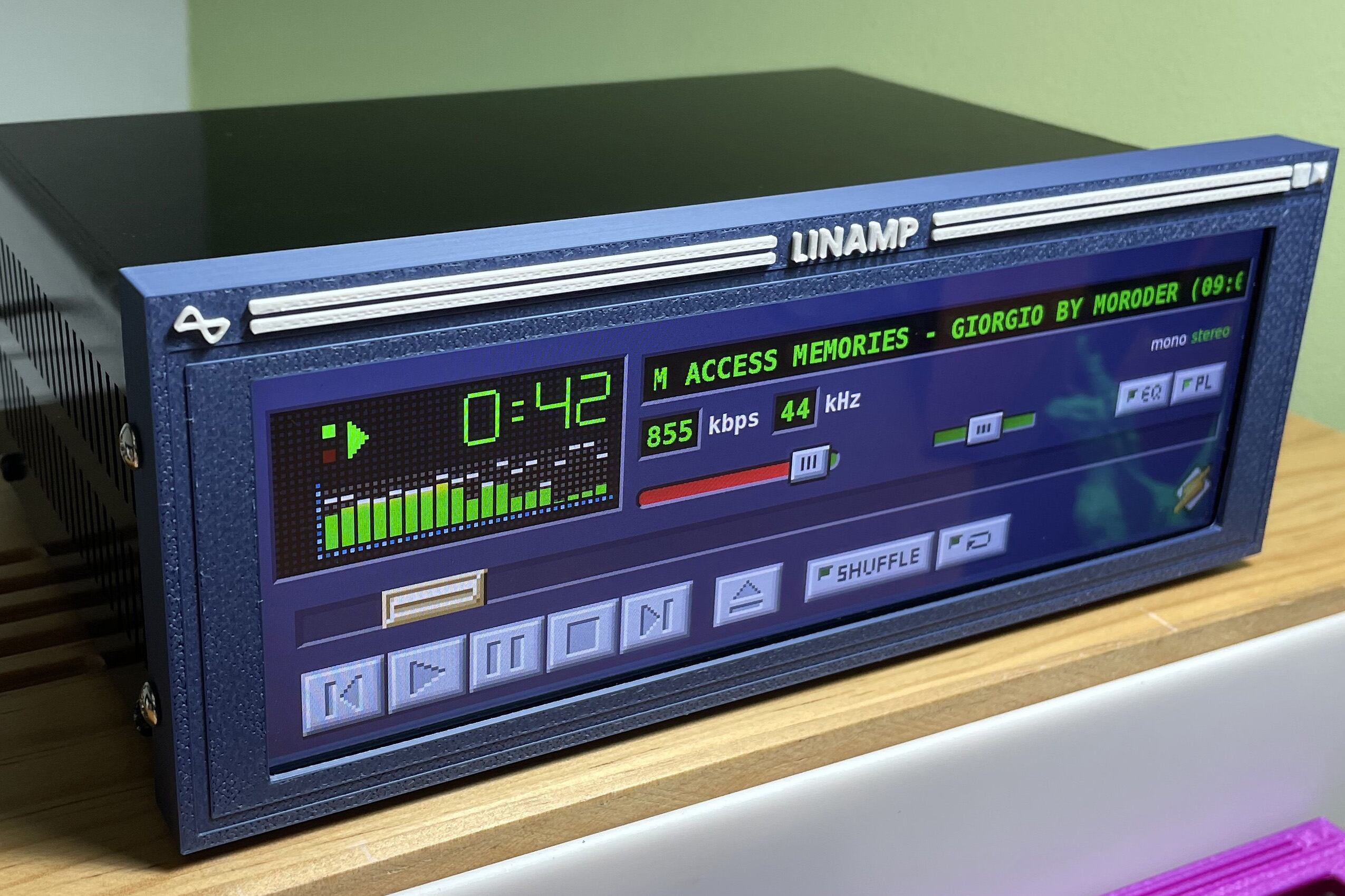 Encima, el buen Rodmg se inspiró en un estéreo Aiwa de su infancia para diseñar la carcasa de Linamp, construyéndola en chapa de metal oscura con aluminio anodizado de 1 mm para darle vida a Winamp como un objeto físico.