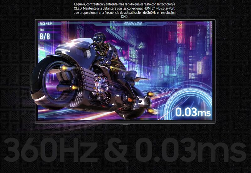 Este monitor especializado te brinda lo mejor para tus videojuegos con las conexiones HDMI 2.1 y DisplayPort, que proporcionan una frecuencia de actualización de 360Hz en resolución QHD. Además tiene un tiempo de respuesta de 0.03ms (GtG). Precisión total.