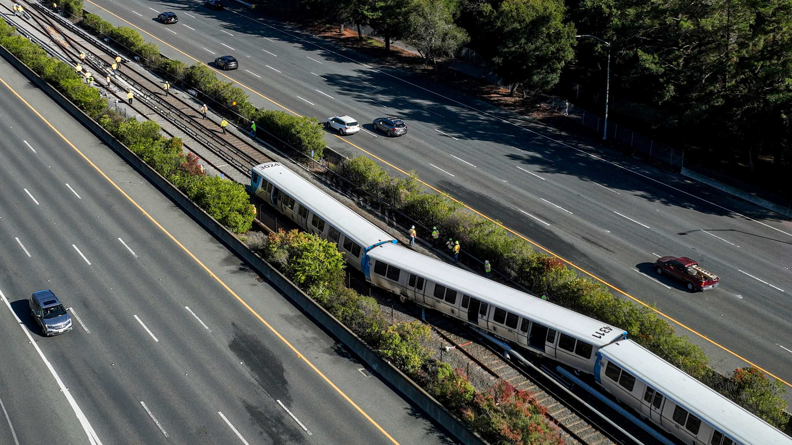 Cuadrillas trabajan cerca de vagones descarrilados del sistema BART en las vías entre las estaciones de Orinda y Lafayette, el lunes 1 de enero de 2024, en Orinda, California. (Brontë Wittpenn/San Francisco Chronicle vía AP) AP (Brontë Wittpenn/AP)