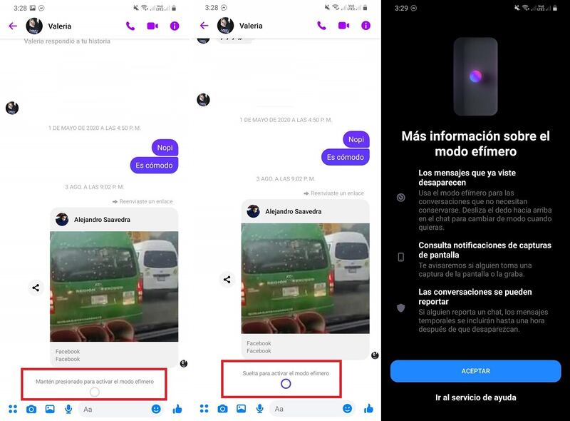 Con respecto al modo efímero de Messenger e Instagram, el mismo permite a los usuarios enviar mensajes, GIFs, stickers, fotos o videos que se desaparecen tan pronto como son vistos y se cierra la conversación en la que se comparten.