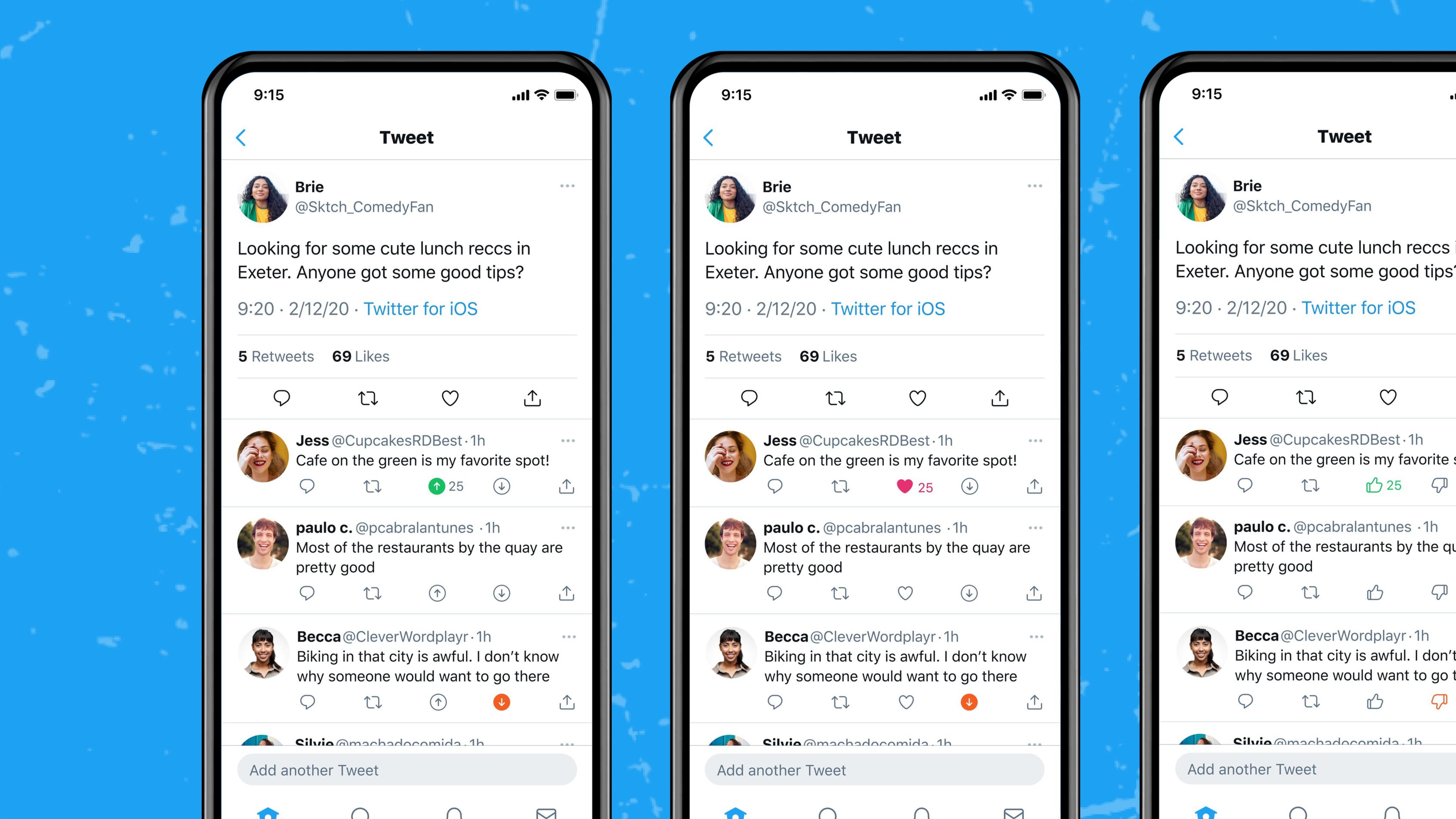 Una tercera versión mostró a los probadores botones de pulgar hacia arriba y hacia abajo en su lugar. Twitter no dijo si las nuevas pruebas globales ofrecerían las mismas opciones.