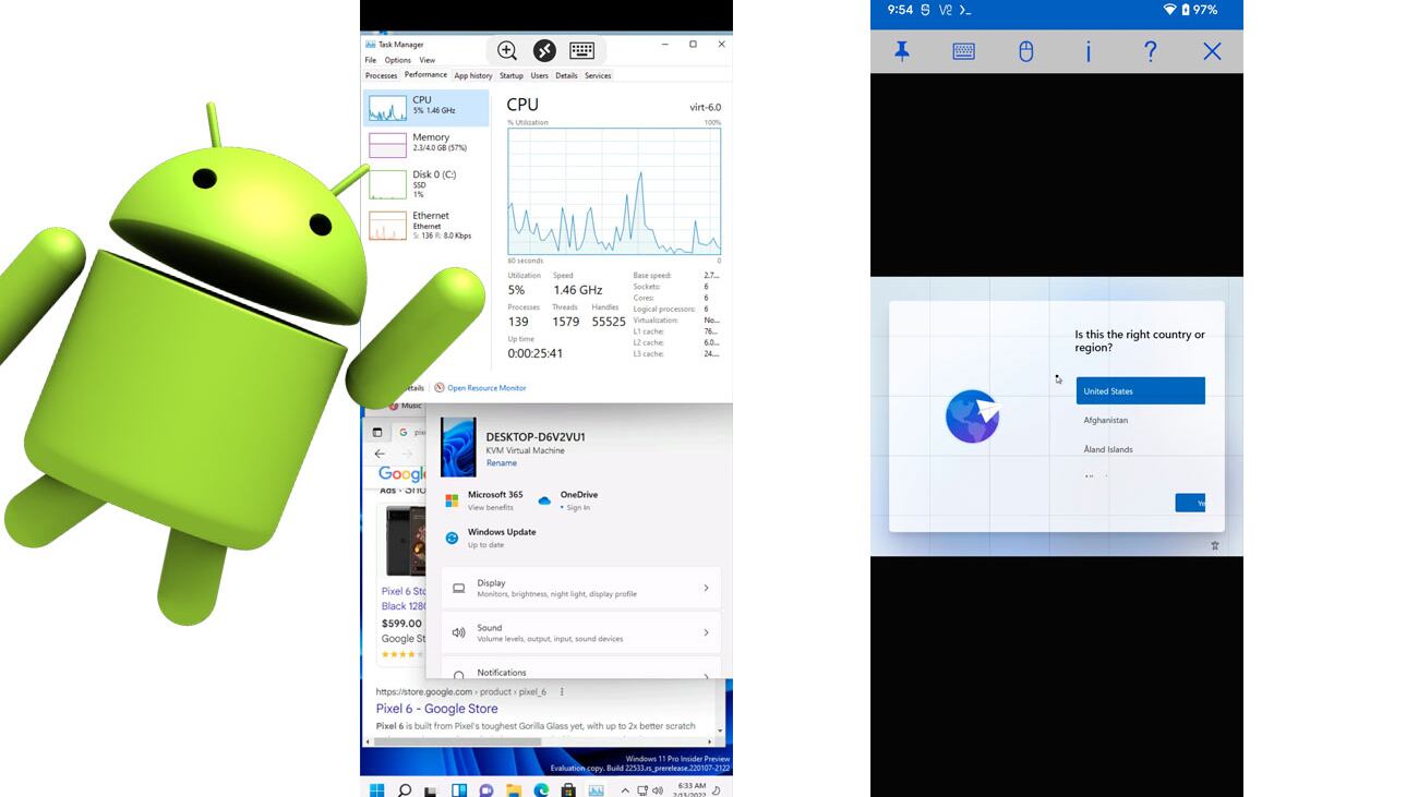 Así que Lin decidió poner a prueba ambos sistemas operativos, ejecutando Windows 11 en su Google Pixel 6 a través de una Máquina Virtual (VM, por sus siglas en inglés), después de haber actualizado el dispositivo móvil a la Android 13 Developer Preview 1.
