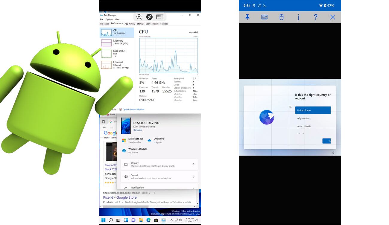 Así que Lin decidió poner a prueba ambos sistemas operativos, ejecutando Windows 11 en su Google Pixel 6 a través de una Máquina Virtual (VM, por sus siglas en inglés), después de haber actualizado el dispositivo móvil a la Android 13 Developer Preview 1.