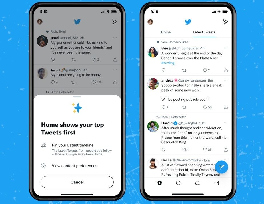 En la aplicación para iOS, y «pronto» también en Android y la web, Twitter ha rediseñado la página de inicio para mostrar dos pestañas: inicio y los últimos, entre los que el usuario puede moverse para revisar todas las publicaciones.