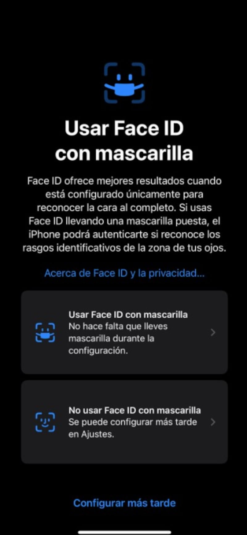 Justo antes de dejar activada la función, nuestro teléfono nos explicará que “el iPhone puede reconocer las características únicas alrededor del área de los ojos para autenticarse”, pero advierte que Face ID será más preciso si lo configura para que no funcione con una mascarilla.