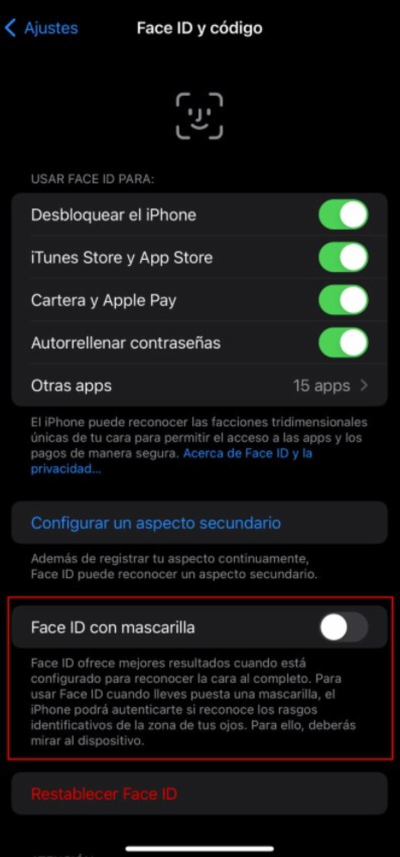 Añade además que es posible utilizar Face ID si llevas mascarilla para usar Apple Pay y autorrellenar contraseñas en otras aplicaciones y Safari.