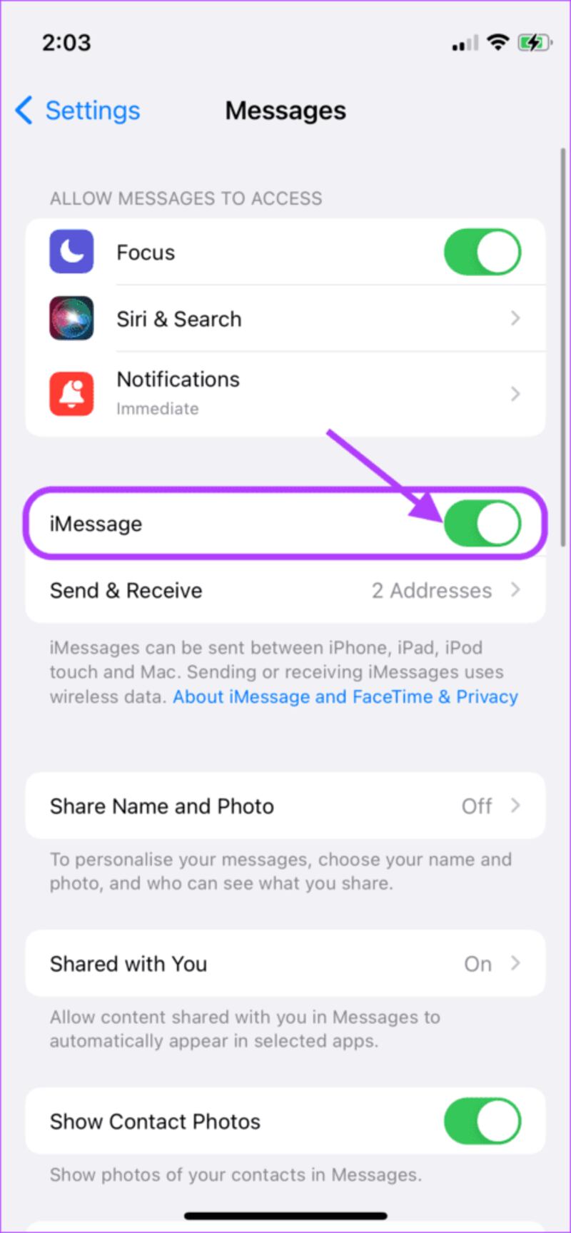 iMessage utiliza su número de teléfono o ID de correo electrónico para conectar el servicio de mensajería con su cuenta de Apple. Por lo tanto, es recomendable cerrar sesión en la app para eliminar cualquier acceso a sus mensajes privados.