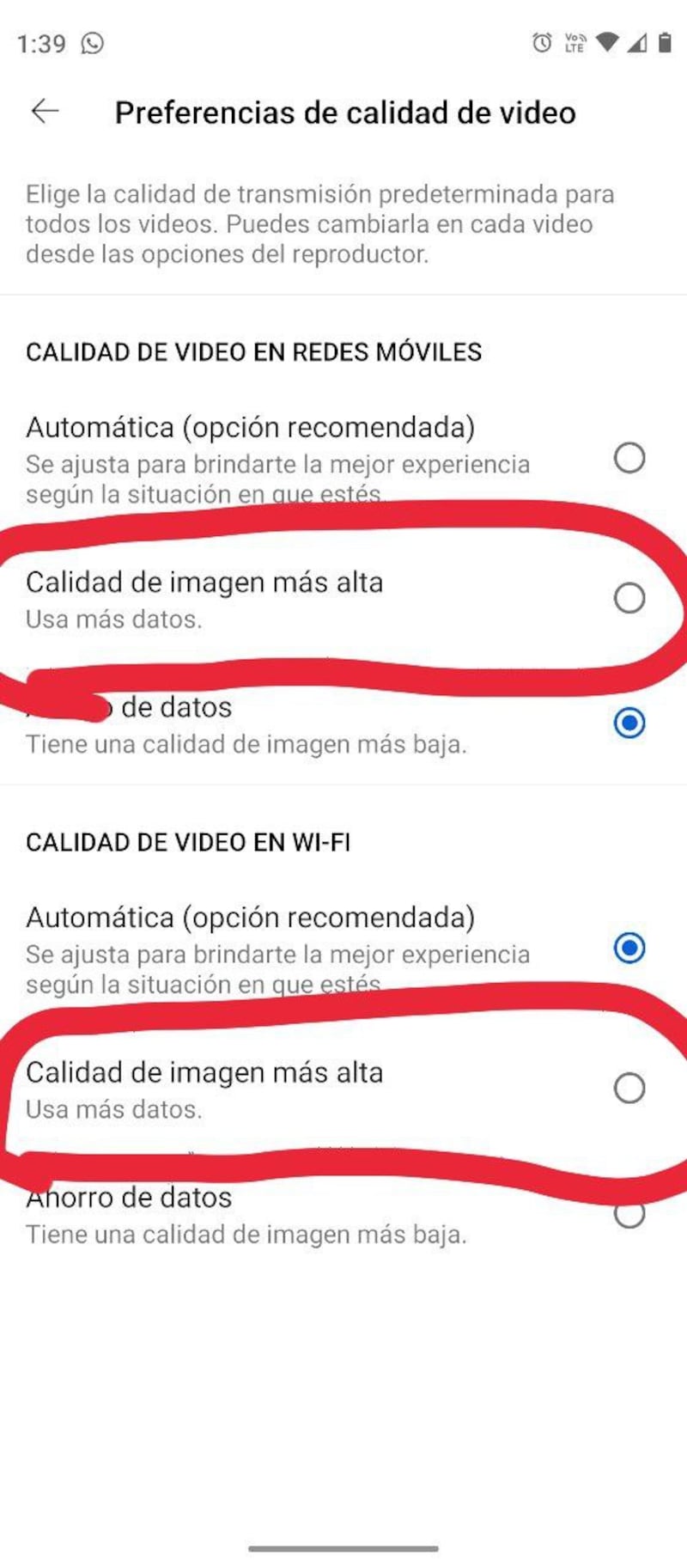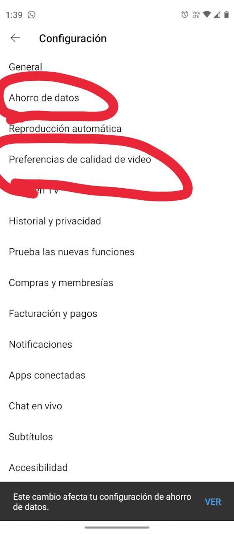 En este apartado encontraremos dos opciones vitales para solucionar el problema con la calidad de reproducción de nuestros videos: “Ahorro de datos” y “Preferencias de calidad de video”.